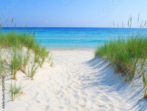Serene Beach Path with Lush Greenery Leading to Tranquil Turquoise Sea and Clear Blue Sky