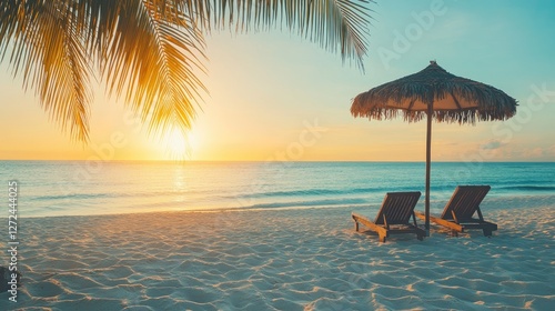 Serene beach sunset scene with sun loungers, umbrella, and palm fronds swaying in the breeze, soft white sand, and peaceful ocean stretching to the horizon. No people no text