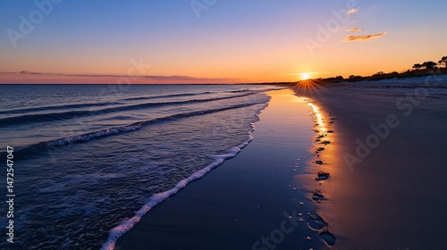 Serene Beachscape at Sunset: Footprints on the Shoreline Under an Orange Sky