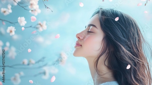 Serene Beauty, A Woman Surrounded by Falling Cherry Blossoms
