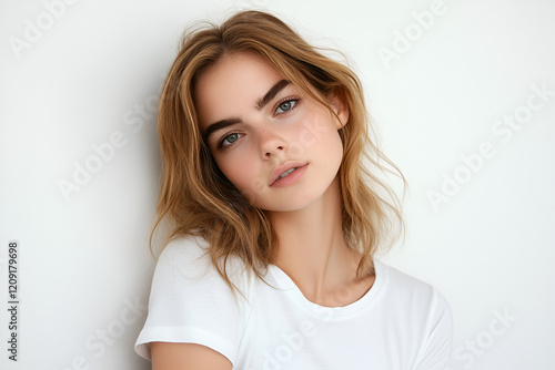 Serene Beauty: A young woman with light brown hair and captivating green eyes gazes gently into the camera, exuding natural charm and a sense of quiet confidence.