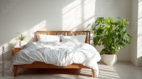 Serene Bedroom Retreat: A bright, airy bedroom with a natural wood bed, crisp bedding, and lush indoor plants, bathed in soft sunlight creating a tranquil atmosphere.