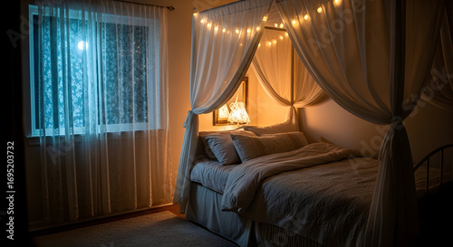 Serene Bedroom Scene With Canopy Bed And Soft Lighting Illuminating Comfort
