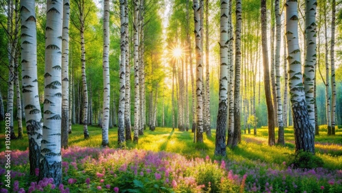 Serene Birch Forest bathed in golden sunlight, wildflowers carpeting the forest floor, creating a magical, peaceful atmosphere.
