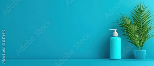 Serene Blue: A Minimalist Bathroom Scene with Soap Dispenser and Tropical Plant