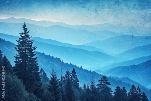 Serene Blue Mountainscape A Vista of Rolling Hills and Silhouetted Evergreens Under a Hazy Sky