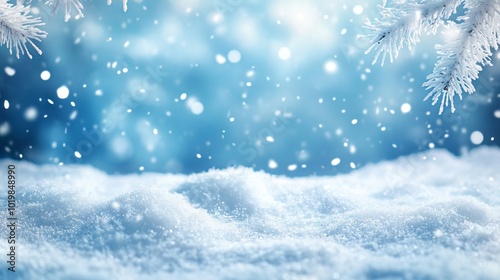 Serene blue winter wonderland with falling snowflakes and snow-covered landscape