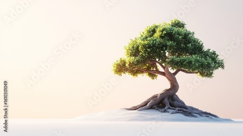 Serene Bonsai Tree on White Sand, Soft Lighting, Peaceful Nature Scene.