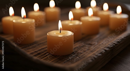 Serene Candlescape: A Glimmering Gathering of Lit Candles on Rustic Wood