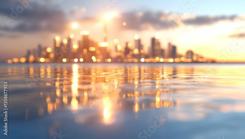 Serene cityscape at sunset, reflected in calm water. Golden hour light bathes the urban skyline, creating a tranquil and dreamy atmosphere