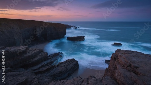 Serene coastal landscape at dusk with waves crashing against rocky cliffs.