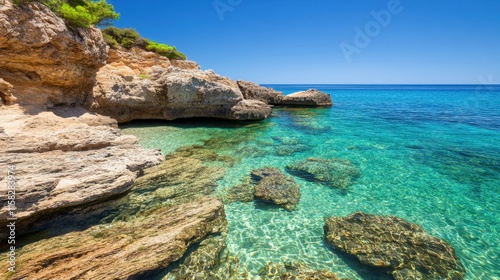 Serene Coastal Landscape with Crystal Clear Water and Rocky Shoreline