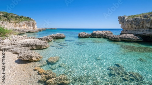 Serene Coastal Scene of Turquoise Water and Rocky Cliffs in Salento Italy Landscape View