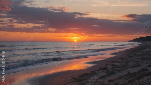 Serene Coastal Sunset Over Tranquil Beach Waves with Vibrant Sky Reflection