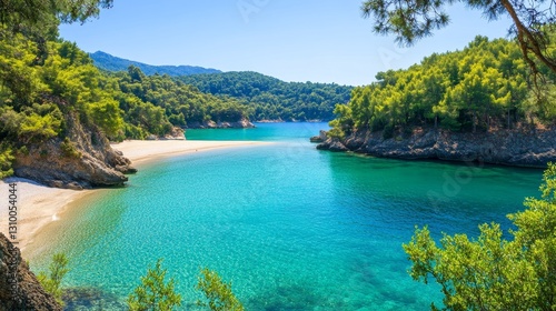 Serene coastal view of a secluded beach surrounded by lush greenery and clear turquoise waters