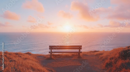 Serene Coastal Viewpoint with Wooden Bench Overlooking Ocean Sunrise