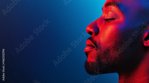 Serene Contemplation: A close-up shot features a black man's profile, his eyes closed in peaceful contemplation, illuminated by dynamic, vibrant light play of red and blue.