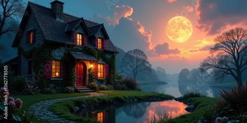 Serene Cottage by the Water's Edge, Illuminated by a Full Moon's Glow at Twilight