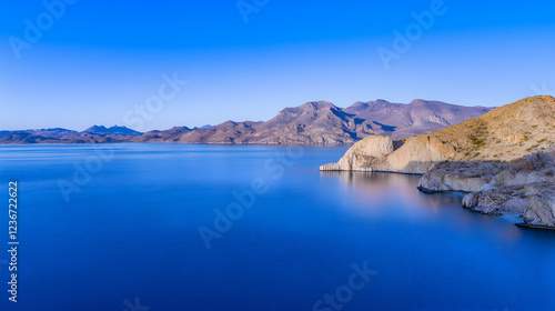 Serene desert lake sunrise, mountains backdrop, calm waters, travel poster