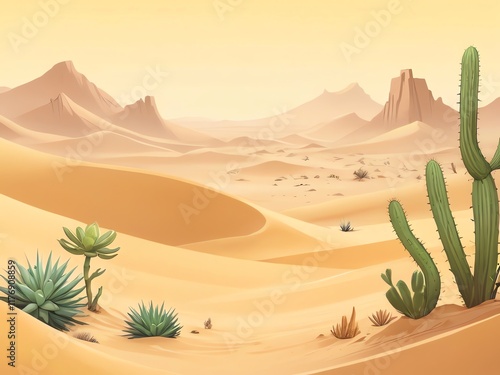 Serene Desert Landscape: Golden Sands, Majestic Mountains, and Resilient Desert Flora