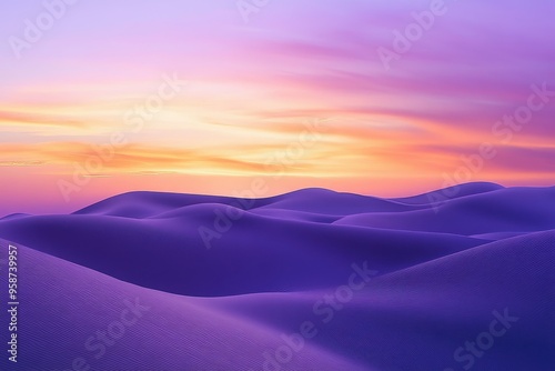 Serene desert landscape at sunset with gentle purple dunes and a colorful sky.