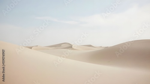Serene desert landscape with soft golden sand dunes under a pale blue sky, showcasing natural beauty and minimalistic scenery.