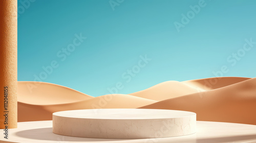 serene desert oasis scene featuring circular podium against soft sand dunes and clear blue sky, perfect for showcasing products or art