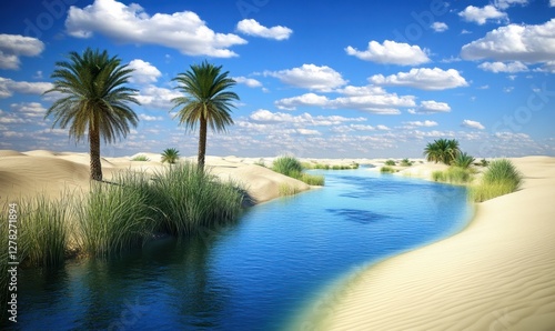 Serene desert oasis with palm trees and a winding river under a bright blue sky