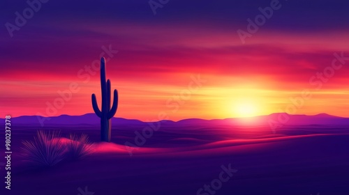 Serene desert travel background with a lone cactus silhouetted against a glowing sunset over distant dunes.