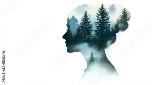serene double exposure silhouette of woman with forest landscape, showcasing beauty of nature intertwined with human form. This artistic representation evokes sense of tranquility and connection