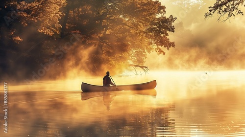 Serene early morning canoe ride amidst golden mist on a tranquil lake, surrounded by autumn foliage.
