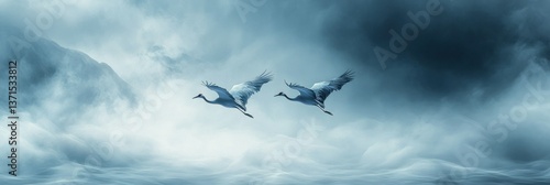 Serene Flight: Cranes Soaring Through Ethereal Sky and Cloudy Horizons