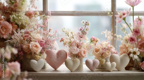 Serene Floral Arrangement with Hearts by a Bright Window Featuring Delicate Pink Flowers and Softly Textured Decorative Accents in an Elegant Setting