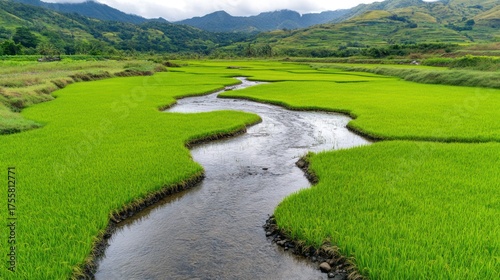 Serene Flowing Stream Through Lush Green Rice Fields With Majestic Mountains Under Overcast Sky