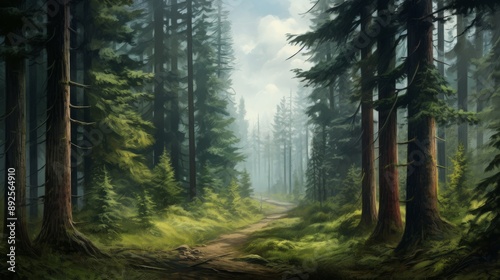 Serene forest landscape with spruce, fir, and pine trees, soft light, lush greenery