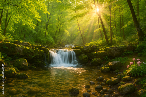 Serene Forest Landscape with Waterfall and Sunbeams Casting Warm Light