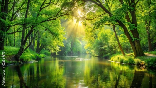 Serene forest next to tranquil river with sunlight filtering through lush green trees