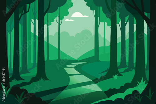 Serene forest path meanders through lush green trees and rolling hills, sunlight filtering through canopy.