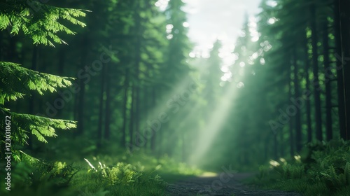 Serene Forest Path with Sunlight Filtering Through Tall Trees