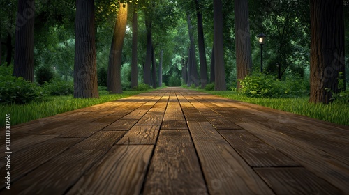 Serene Forest Pathway with Wooden Planks Surrounded by Lush Greenery and Gentle Lighting