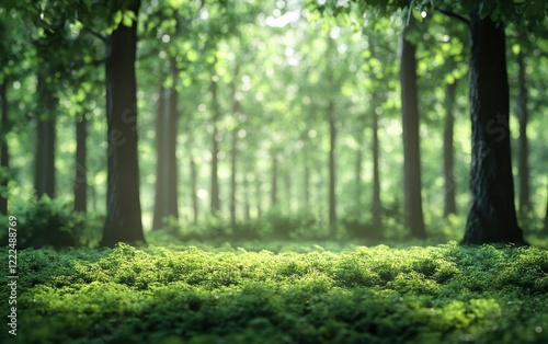 Serene Forest Scene with Sunlight Filtering Through Green Canopy, Lush Undergrowth.
