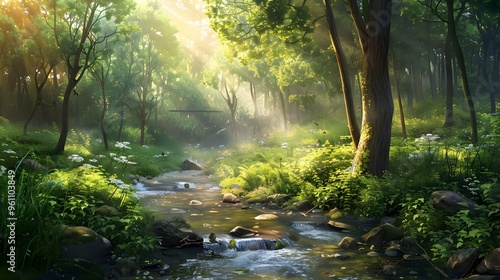 Serene Forest Stream with Sunlight Breaking Through the Canopy