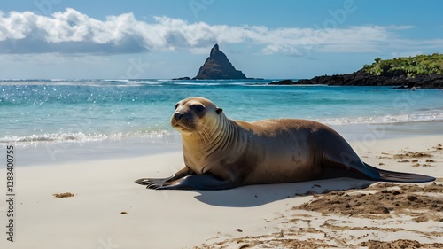 Serene Galápagos Sea Lion Resting on a Sandy Beach with a Stunning Turquoise Sea