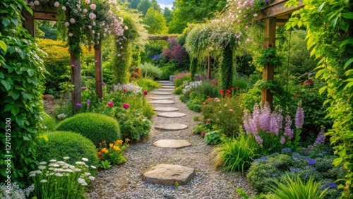 Serene Garden Path with Stone Stepping Stones and Lush Blooming Flowers Under Wooden Pergolas