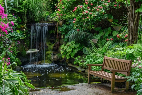 Serene Garden with Waterfall, Lush Greenery, and Blooming Flowers for Relaxation Posters or Cards