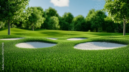 Serene Golf Course Landscape - Lush green grass, sand bunkers, trees, sunny day, peaceful scene. Symbolizes relaxation, nature, sport, challenge, success.
