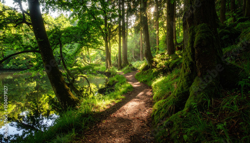 Serene Green Forest with Gentle Sunlight and Nature Path