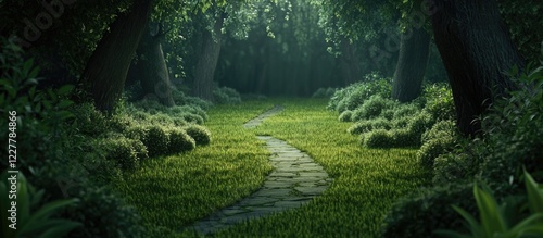 Serene Green Pathway Through Lush Forest with Abundant Grass and Trees Ideal for Nature Themes and Text Overlay