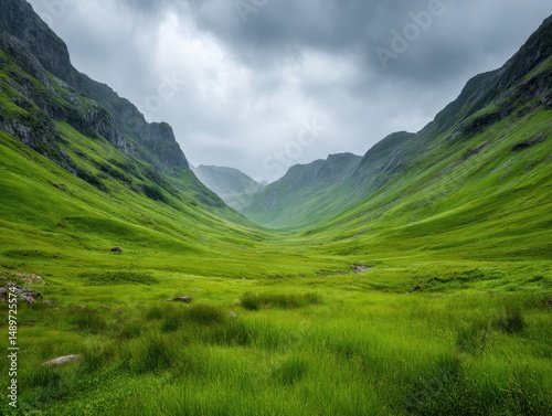 Serene Green Valley Surrounded by Majestic Mountains Under Overcast Sky Captured in Scotland's Highlands