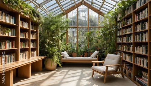 Serene Greenhouse Library Wooden Bookshelves Daybed Plants